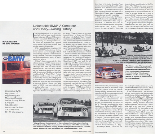 "Some of the most fun I had writing the book was working with and talking to the enthusiastic owners in the States?BMW CCA members," Walton says. To prove his point, the magical 1996 Monterey Historic Races weekend, where BMW was the featured marque, is highlighted in several sections. Many of the photos of members' cars at that event, were taken by Roundel's Klaus Schnitzer; it's as if Unbeatable was written with BMW CCA members specifically in mind. Judging by the brisk sales at this year's Oktoberfest in Orlando, where the author was present, that was probably a good idea.